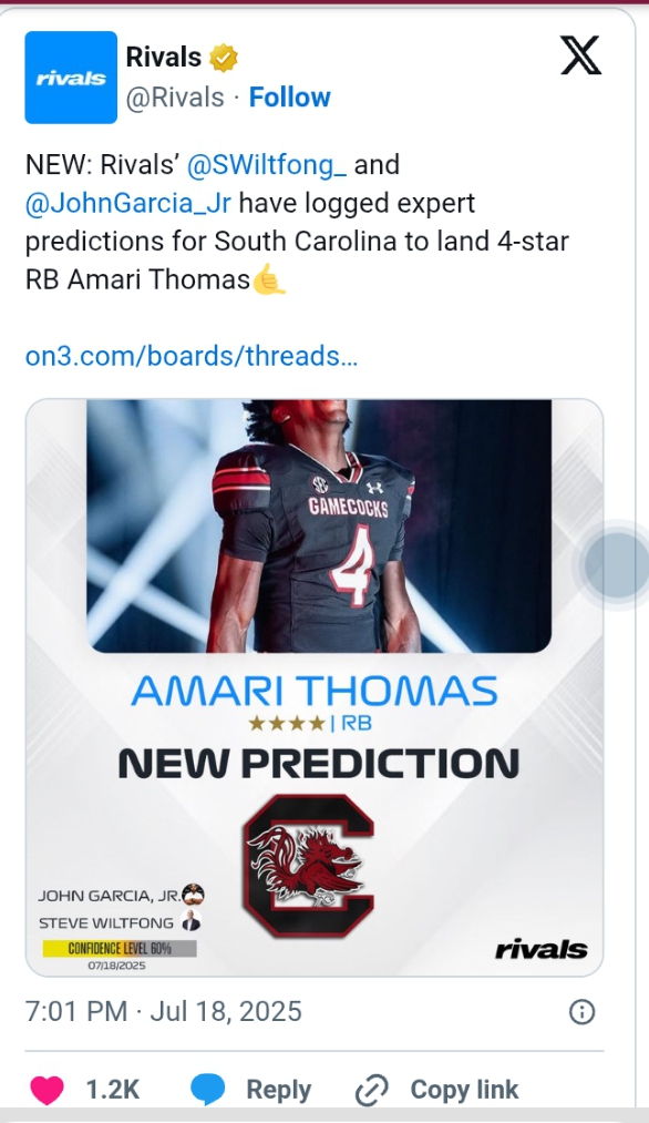 It’s looking more and more likely that former Florida State running back commit Amari Thomas is heading to Columbia. The four-star prospect out of Northwest Florida (Blountstown/Marianna) is expected to officially flip to South Carolina in the coming week or two, just as many predicted.