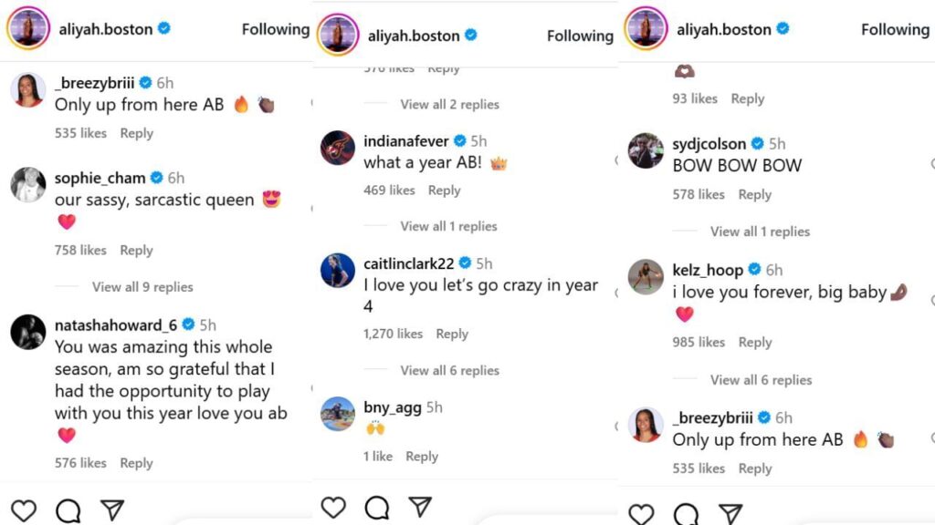 Her post quickly drew love from her teammates, who rallied behind the star center. Caitlin Clark replied, “I love you let’s go crazy in year 4,” while Sophie Cunningham added, “Our sassy, sarcastic queen 😍❤️.”