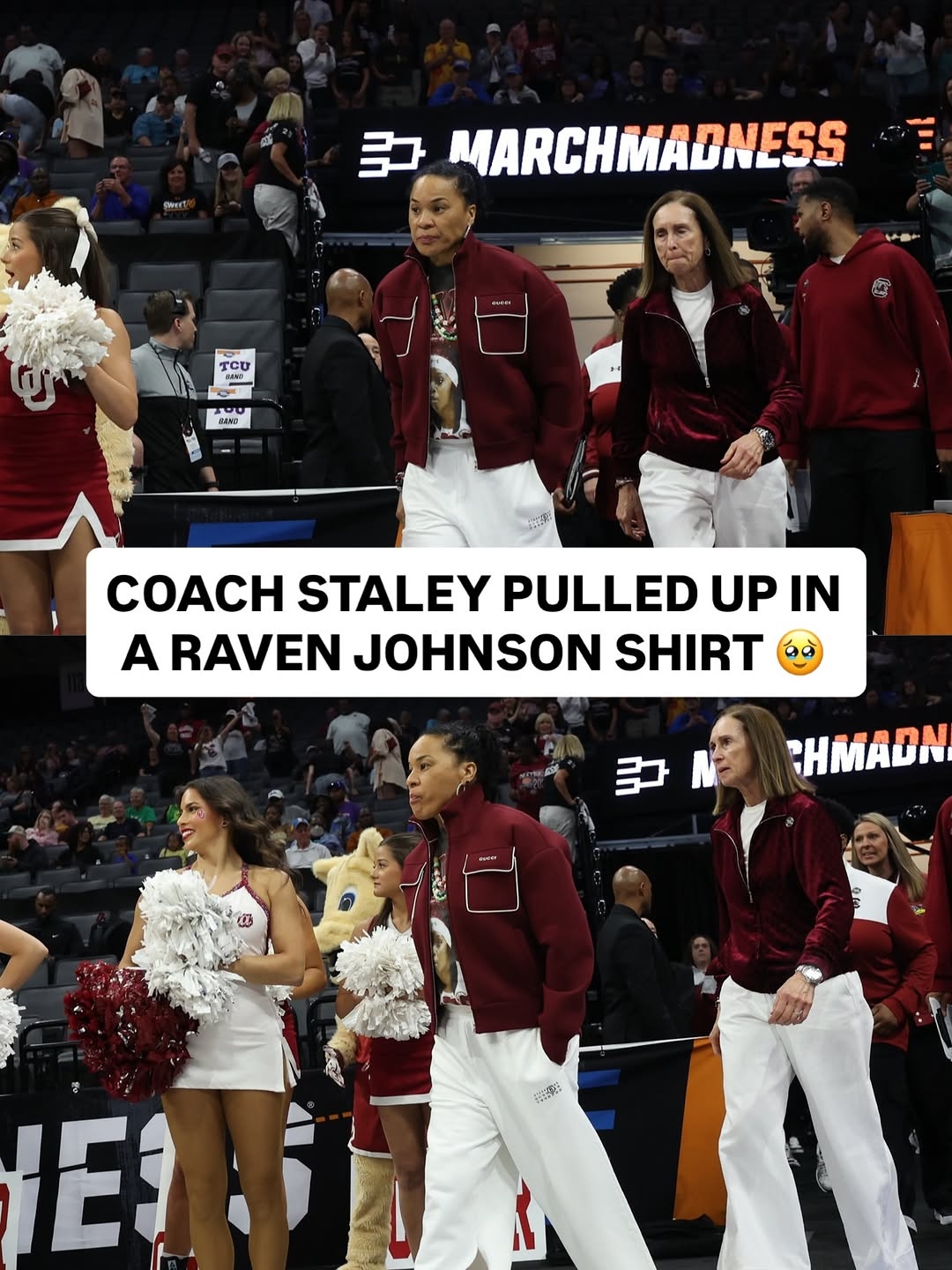 For the No. 1 seed’s Sweet 16 matchup against Oklahoma, Staley stepped out in a garnet-shaded Gucci jacket paired with white Maison Margiela sweatpants, garnet shoes she’s worn in each of the last two March Madness games, and a custom Raven Johnson shirt from Playa Society — the same shirts that dropped earlier this week and sold out almost immediately.