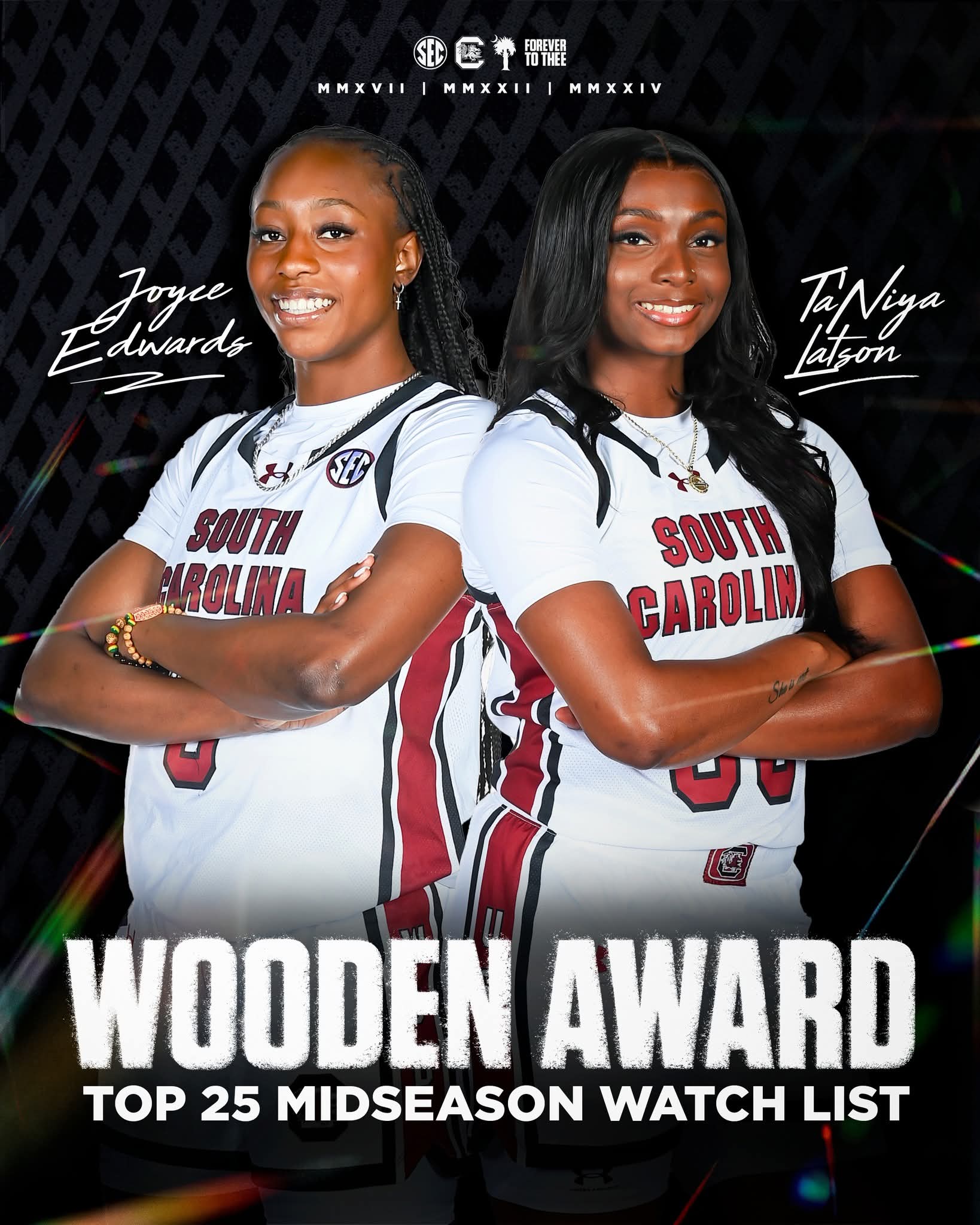 Two of **South Carolina’s brightest women’s basketball stars — forward Joyce Edwards and guard Ta’Niya Latson — have been honored on the John R. Wooden Award 2025-26 Women’s Midseason Top 25 Watch List, reinforcing their status among the nation’s elite players and adding national recognition to the Gamecocks’ strong season. (University of South Carolina Athletics)
