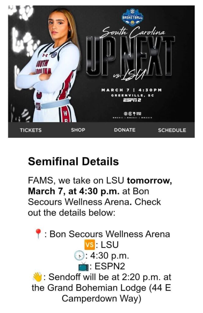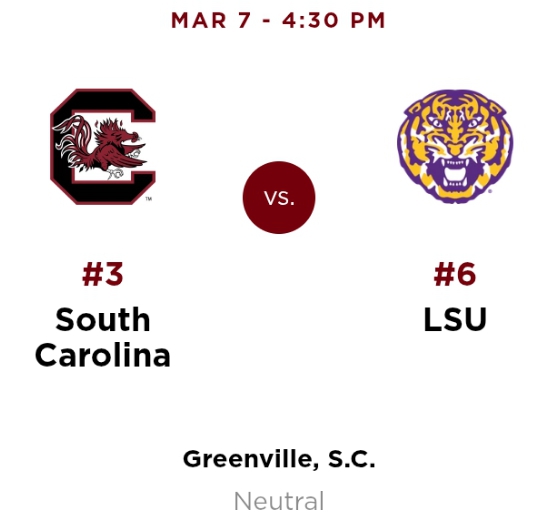 This semifinal is also a rematch of a regular-season meeting earlier this year when South Carolina defeated LSU 79–72, extending the Gamecocks’ winning streak over the Tigers to 18 consecutive games.