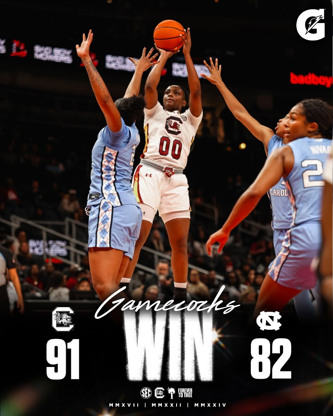 ATLANTA — South Carolina’s new-look offense found its rhythm Thursday night as Ta’Niya Latson and Tessa Johnson each poured in 19 points, powering the Gamecocks to a 91–82 exhibition win over North Carolina.