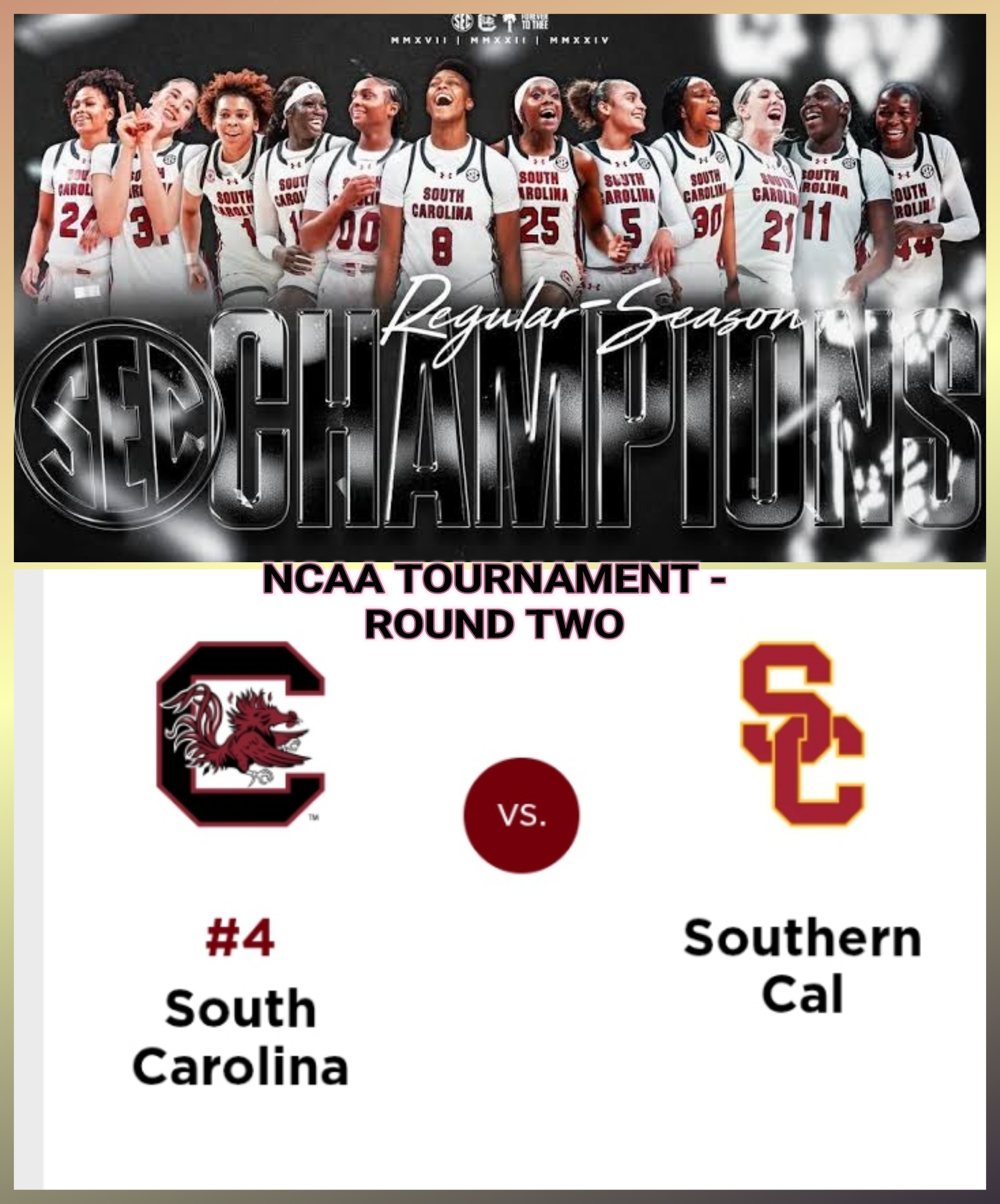 Game: No. 1 South Carolina Gamecocks (32-3) vs. No. 9 USC Trojans (18-13)