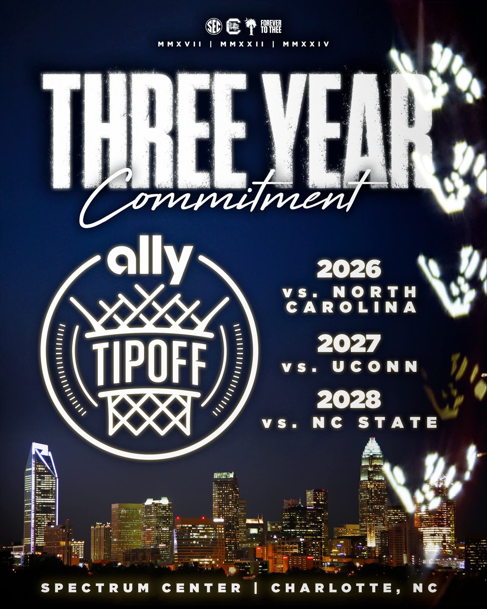 COLUMBIA, S.C. – The South Carolina women’s basketball program is set to remain a fixture at one of the sport’s premier showcases. The Charlotte Sports Foundation announced that the Gamecocks will compete in the Ally Tipoff at the Spectrum Center in Charlotte, North Carolina, for the next three seasons — from 2026 through 2028.