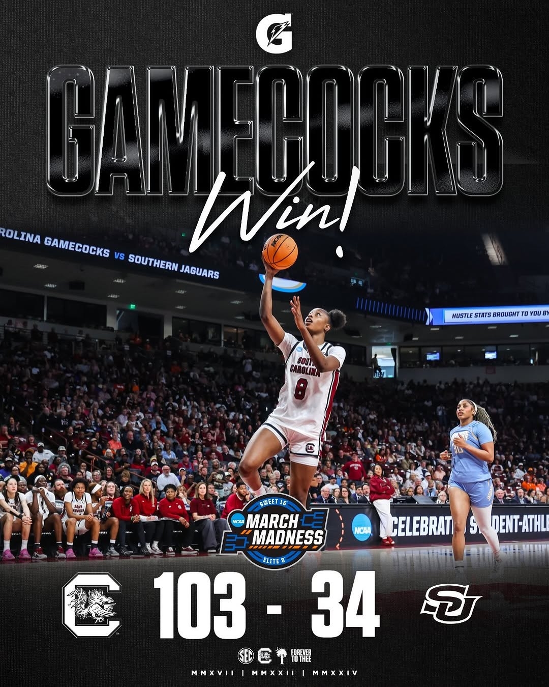 The Gamecocks dismantled Southern 103-34, a 69-point margin of victory that stands as the largest in program history in an NCAA Tournament game. For a team that entered the bracket with a point to prove after last year’s title game loss to UConn, the message could not have been clearer — and it was delivered before most fans had finished their first half of basketball.
