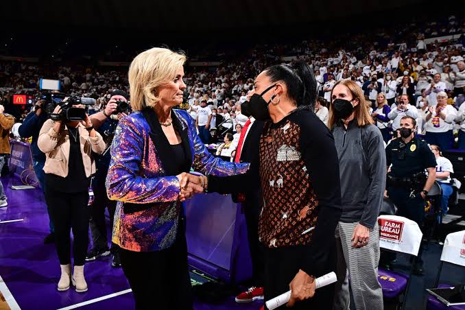 During their pre-game meeting before South Carolina’s 76-70 victory on January 25, 2024, at Pete Maravich Assembly Center, Mulkey whispered to Staley: