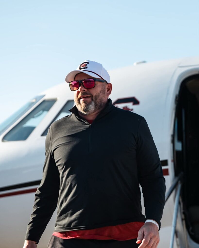 A little over ten minutes later—at exactly 3:16 p.m.—the second plane landed, bringing Briles and Clements in from Texas. Briles, like Drayton, was also sporting the white South Carolina hat as he exited the aircraft. He posed for a quick photo with his wife, Sarah, and their three children in front of the plane before the families packed into SUVs waiting nearby.