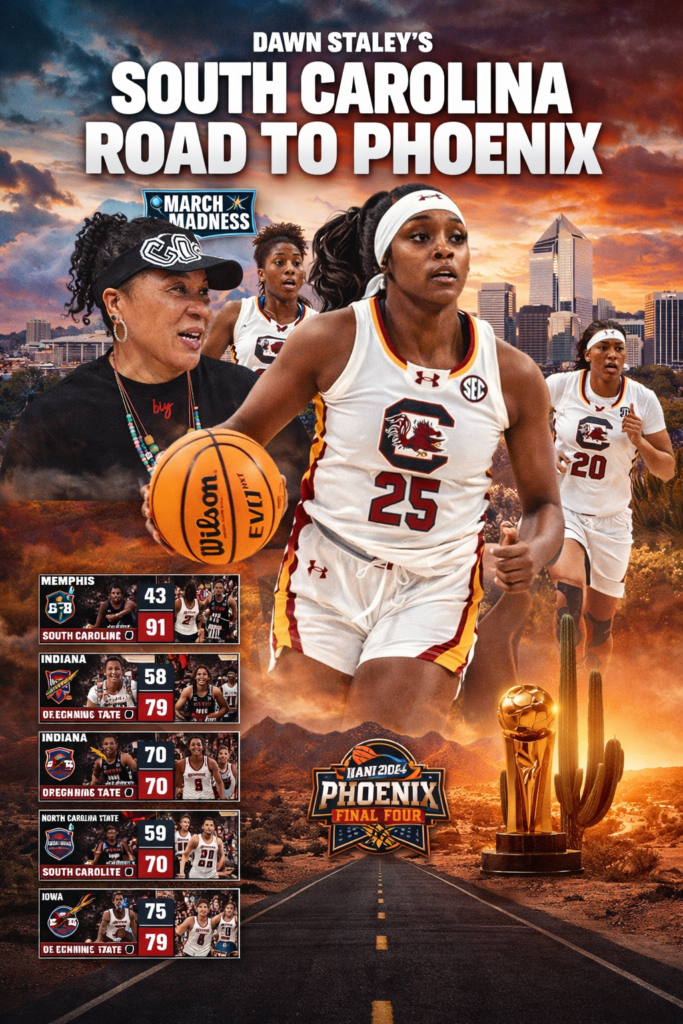 COLUMBIA, S.C. — The bracket is set. The path is visible. And for Dawn Staley’s South Carolina Gamecocks, the destination — a sixth consecutive Final Four and a fourth national championship — is as clear as it has been at the start of any tournament run in recent memory. The question, as always in March, is not what the Gamecocks are capable of. It is who stands in the way.