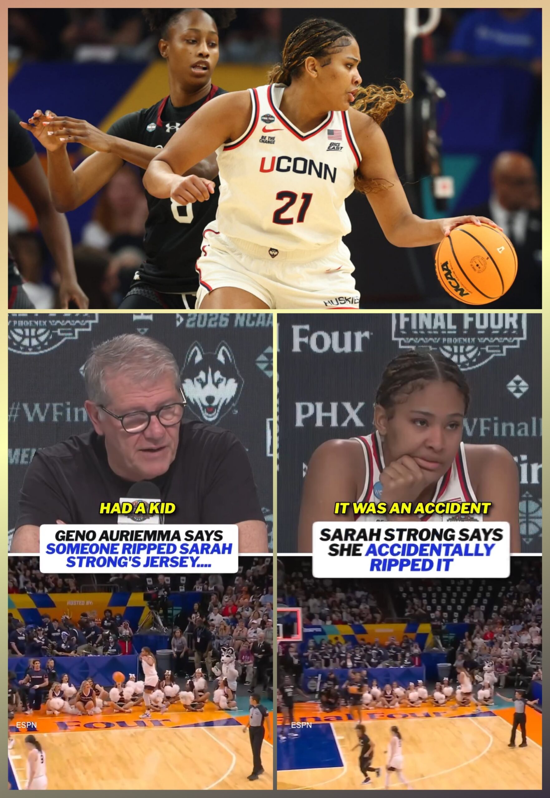 With the third quarter winding down and UConn trailing, Sarah Strong — the Huskies’ best player and a legitimate National Player of the Year candidate — drove and attempted a shot at the buzzer while taking contact. The shot did not go in. No foul was called. Strong looked down at her No. 21 jersey and, in a moment of visible frustration, pulled at it — tearing it in a way that made it unwearable.