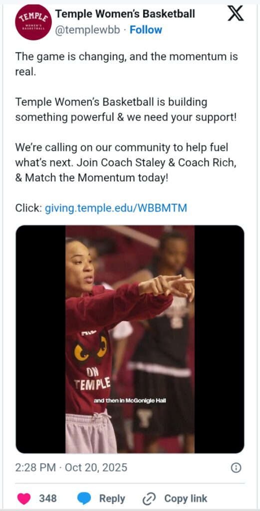 In a powerful show of commitment, Staley has pledged to personally match every donation made through Friday, October 25 — an unprecedented move that reflects her deep bond with Temple and the city of Philadelphia.